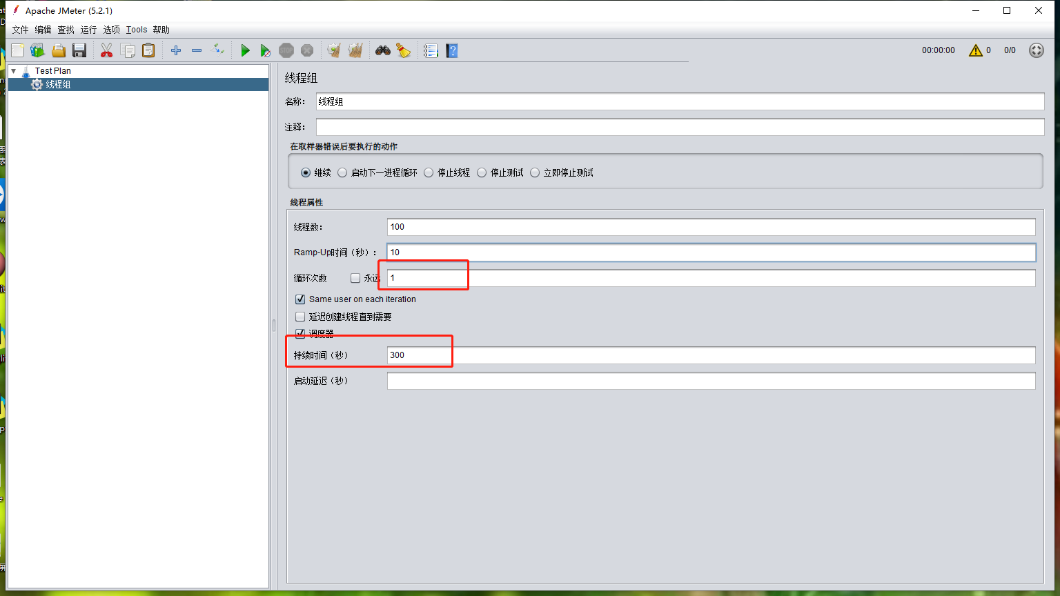 如上述:100个线程循环一次持续时间为300s,此设置是无效的。设置持续时间时,循环次数应该勾选永远。