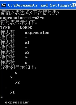 最近在看编译原理,涉及到了词法分析和语法分析等阶段,故此自己尝试着用C++实现了对表达式形如:expression=x1-x2*c的词法分析和语法分析,预想的运行结果为: