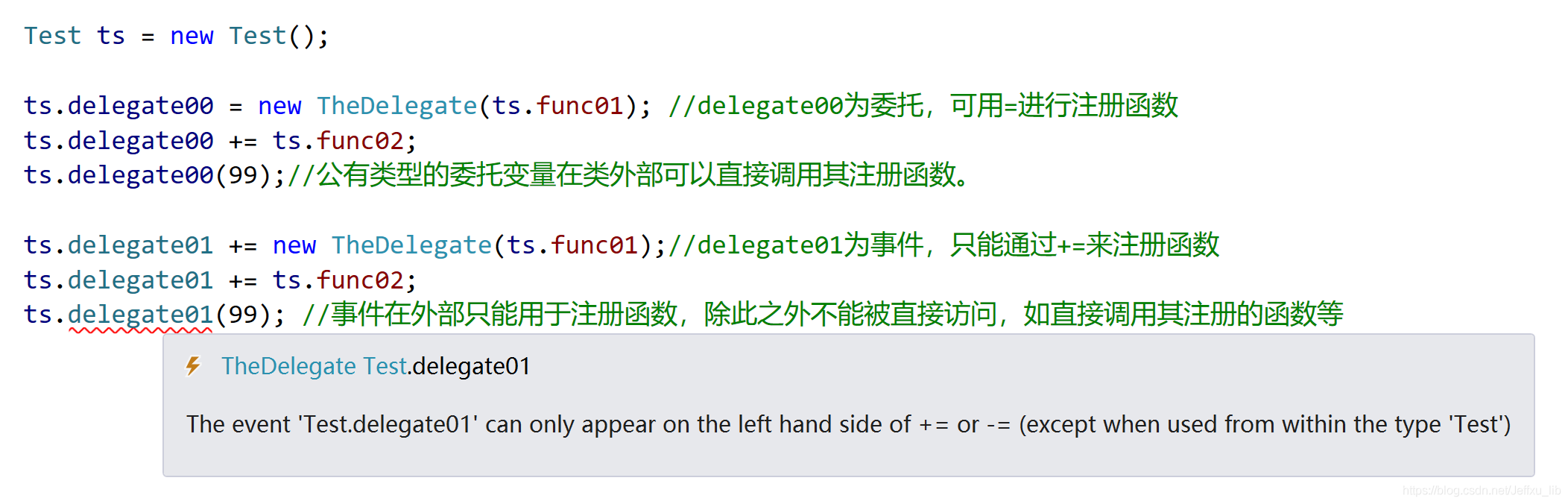 事件与私有的委托变量区别在于,事件可以通过+=和-= 来注册跟删除函数。