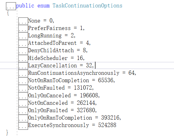因为ContinueWith应用的广泛性,有可能需要不止一个状态条件,所有在类型声明之前加了个Flag特性,用来提供位运算,例如: