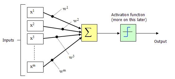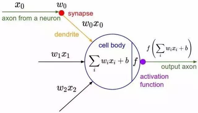 神经元是神经网络中最基本的结构,也可以说是神经网络的基本单元,它的设计灵感完全来源于生物学上神经元的信息传播机制。我们学过生物的同学都知道,神经元有两种状态:兴奋和抑制。一般情况下,大多数的神经元是处于抑制状态,但是一旦某个神经元收到刺激,导致它的电位超过一个阈值,那么这个神经元就会被激活,处于“兴奋”状态,进而向其他的神经元传播化学物质(其实就是信息)。