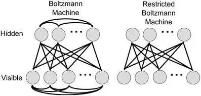 神经网络中有一类模型是为网络状态定义一个“能量”,能量最小化时网络达到理想状态,而网络的训练就是在最小化这个能量函数。Boltzmann(玻尔兹曼)机就是基于能量的模型,其神经元分为两层:显层和隐层。显层用于表示数据的输入和输出,隐层则被理解为数据的内在表达。Boltzmann机的神经元都是布尔型的,即只能取0、1值。标准的Boltzmann机是全连接的,也就是说各层内的神经元都是相互连接的,因此计算复杂度很高,而且难以用来解决实际问题。因此,我们经常使用一种特殊的Boltzmann机——受限玻尔兹曼机(Restricted Boltzmann Mechine,简称RBM),它层内无连接,层间有连接,可以看做是一个二部图。下图为Boltzmann机和RBM的结构示意图: