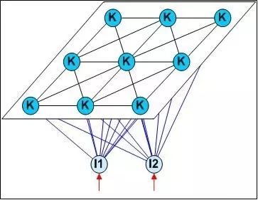 SOM(Self-Organizing Map,自组织映射)网络是一种竞争学习型的无监督神经网络,它能将高维输入数据映射到低维空间(通常为二维),同时保持输入数据在高维空间的拓扑结构,即将高维空间中相似的样本点映射到网络输出层中的临近神经元。下图为SOM网络的结构示意图: