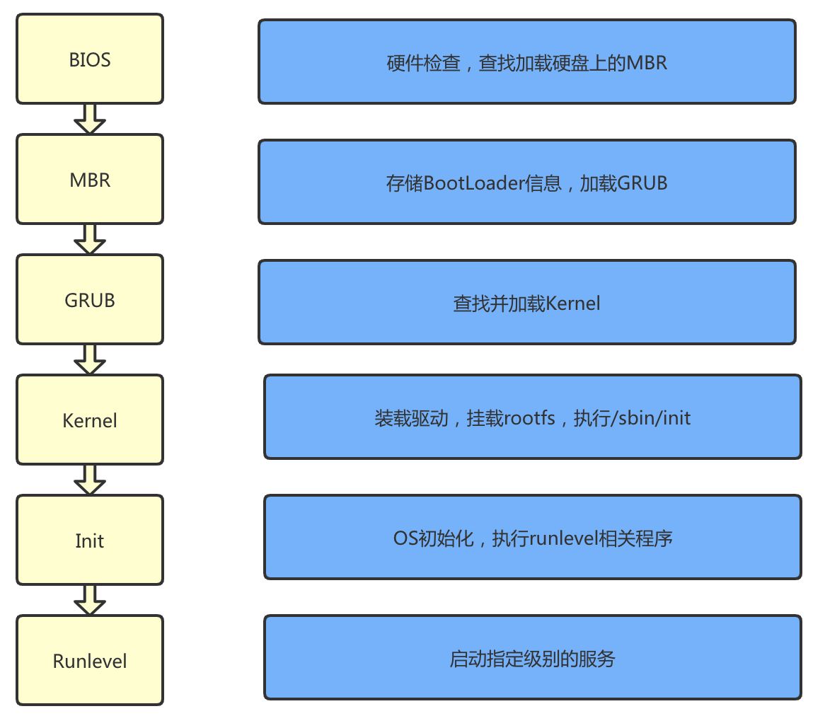 linux引导过程一般包括以下几个阶段: 开机自检 、 MBR 引导 、GRUB 菜单 、加载Linux内核 、 init 进程初始化
