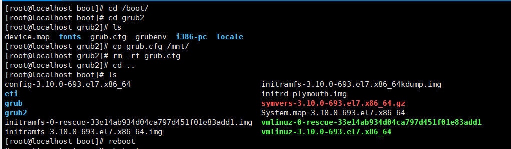 MBR中的GRUB引导程序(1-446字节)遭到破坏 grub.cfg文件丢失,引导配置有误,文件位置/boot/grub2/grup.cfg
