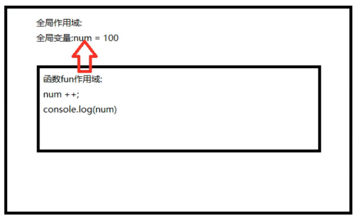 当函数fun第一次调用的时候:在函数作用域中没有变量num,因此会沿着作用域链向上(全局)查询。当函数fun第一次执行的时候将全局变量num由100变为101了,当函数fun第二次执行的时候,将全局变量num由101变为102。