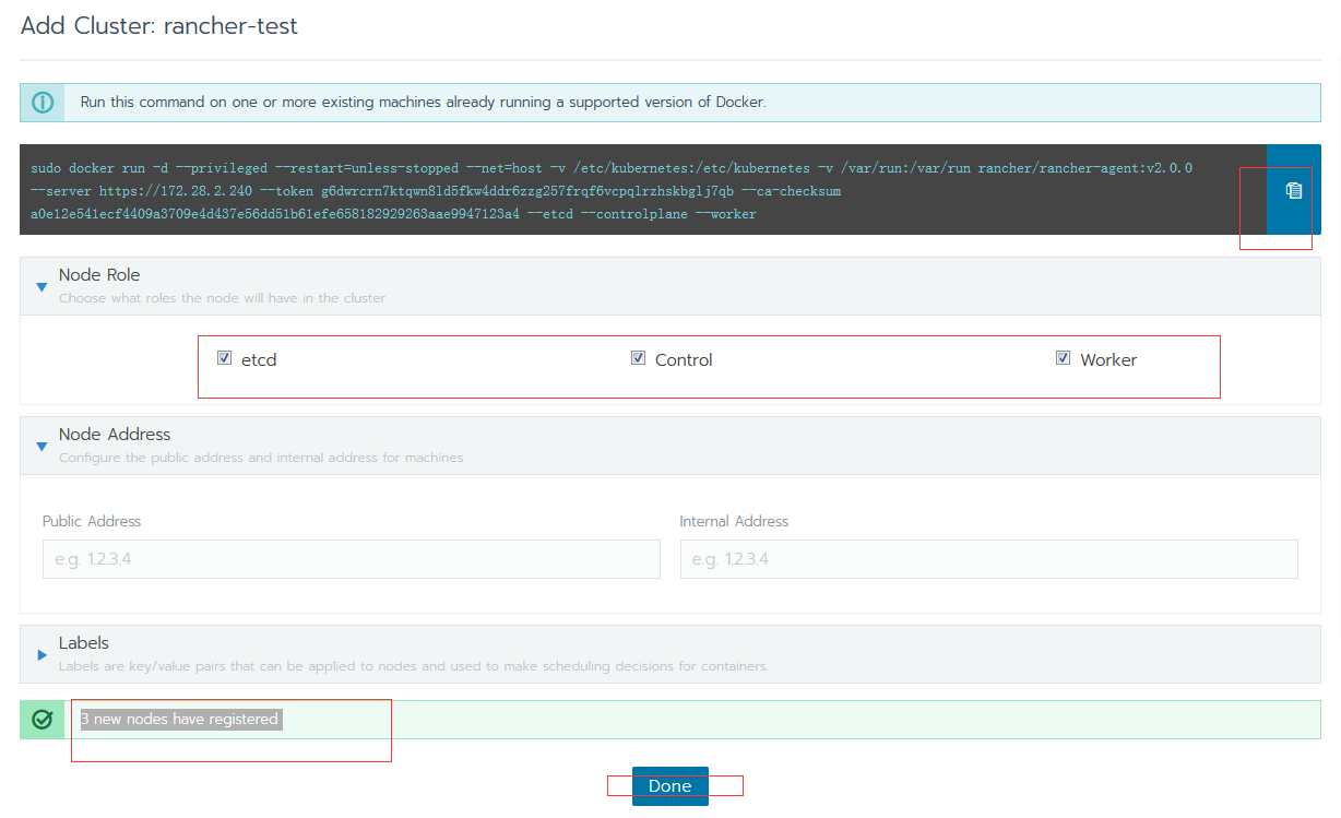 When you finish running the command on your Linux host, click Done.--按图2,上述步骤,及各节点完成dockerrun后,web页面会有提示如:“3 new nodes have registered”
