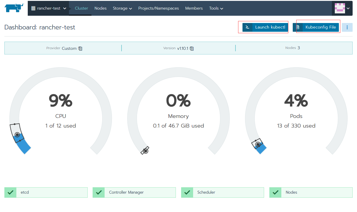 可看到监控界面,及kubectl相关控制台(Launch kubectl);