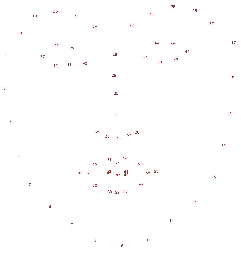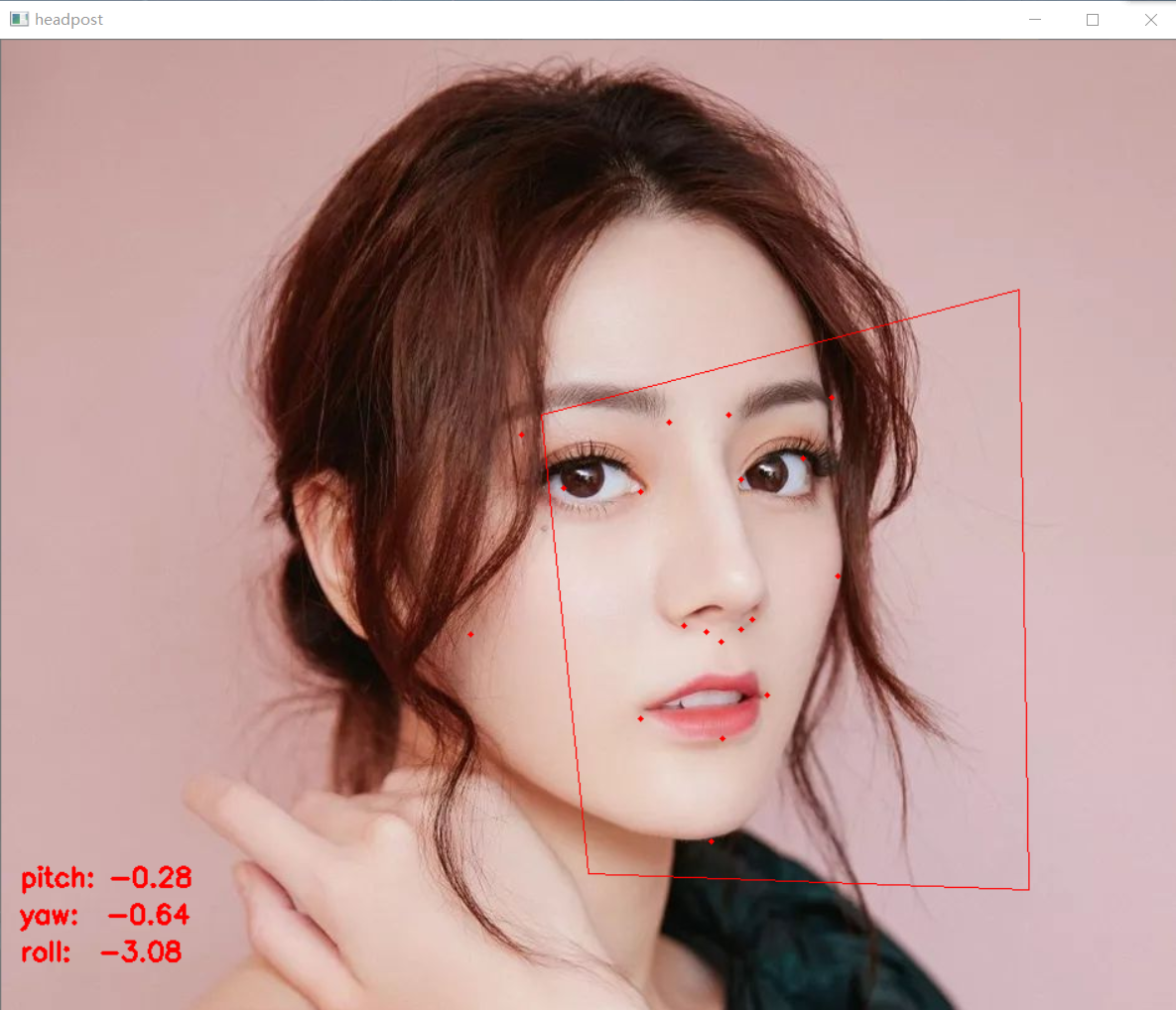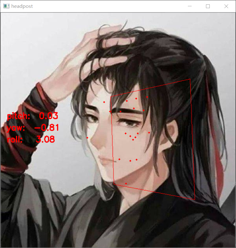 # 头部关键点坐标 self.model_points = np.array([ [6.825897, 6.760612, 4.402142], [1.330353, 7.122144, 6.903745], [-1.330353, 7.122144, 6.903745], [-6.825897, 6.760612, 4.402142], [5.311432, 5.485328, 3.987654], [1.789930, 5.393625, 4.413414], [-1.789930, 5.393625, 4.413414], [-5.311432, 5.485328, 3.987654], [2.005628, 1.409845, 6.165652], [-2.005628, 1.409845, 6.165652], [2.774015, -2.080775, 5.048531], [-2.774015, -2.080775, 5.048531], [0.000000, -3.116408, 6.097667], [0.000000, -7.415691, 4.070434], [-7.308957, 0.913869, 0.000000], [7.308957, 0.913869, 0.000000], [0.746313,0.348381,6.263227], [0.000000,0.000000,6.763430], [-0.746313,0.348381,6.263227], ], dtype='float') # 头部投影点坐标 self.reprojectsrc = np.float32([ [10.0, 10.0, 10.0], [10.0, 10.0, -10.0], [10.0, -10.0, -10.0], [10.0, -10.0, 10.0], [-10.0, 10.0, 10.0], [-10.0, 10.0, -10.0], [-10.0, -10.0, -10.0], [-10.0, -10.0, 10.0]]) # 头部投影点连线坐标 self.line_pairs = [ [0, 1], [1, 2], [2, 3], [3, 0], [4, 5], [5, 6], [6, 7], [7, 4], [0, 4], [1, 5], [2, 6], [3, 7] ]