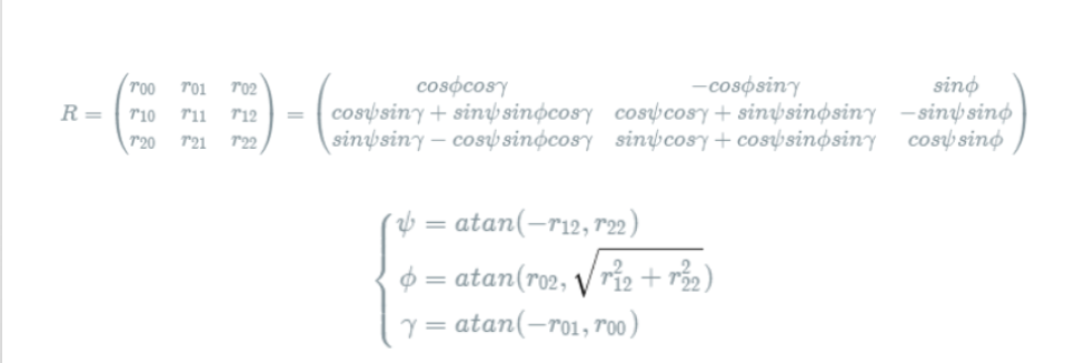 rvec_matrix = cv2.Rodrigues(rotation_vector)[0] proj_matrix = np.hstack((rvec_matrix, translation_vector)) euler_angles = cv2.decomposeProjectionMatrix(proj_matrix)[6] pitch, yaw, roll = [math.radians(_) for _ in euler_angles] return pitch, yaw, roll