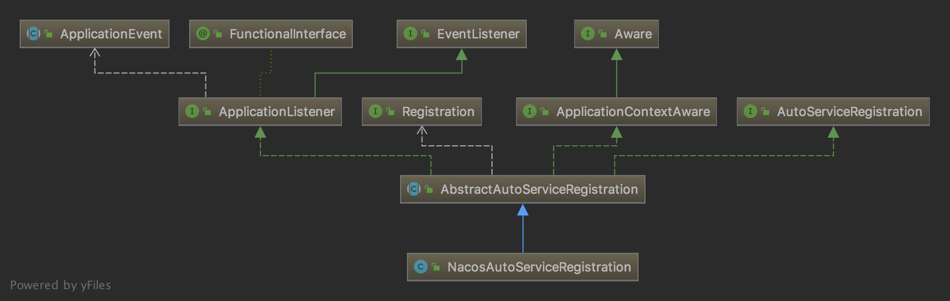 从类图上可以看出NacosAutoServiceRegistration的父类AbstractAutoServiceRegistration实现了两个比较重要的接口:ApplicationListener以及ApplicationContextAware