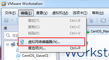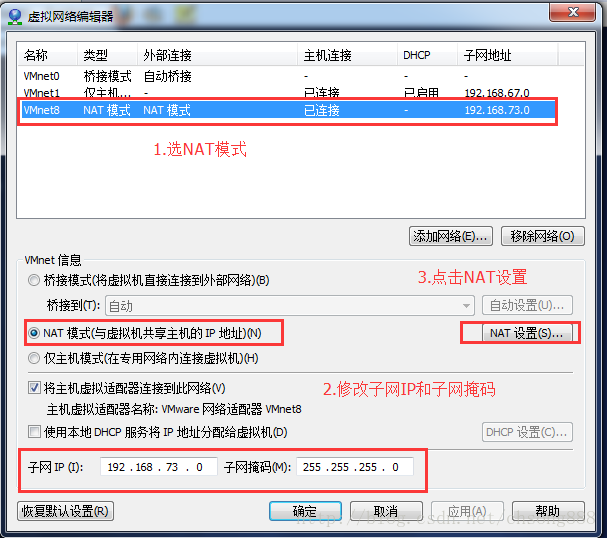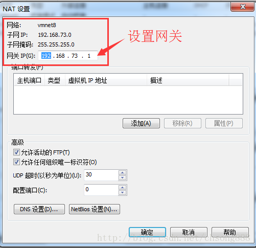1.在菜单栏选择【编辑】→ 【虚拟网络编辑器】,打开虚拟网络编辑器对话框,选择Net网络连接方式,随意设置子网IP,点击NAT设置页面,查看子网掩码和网关,后面修改静态IP会用到