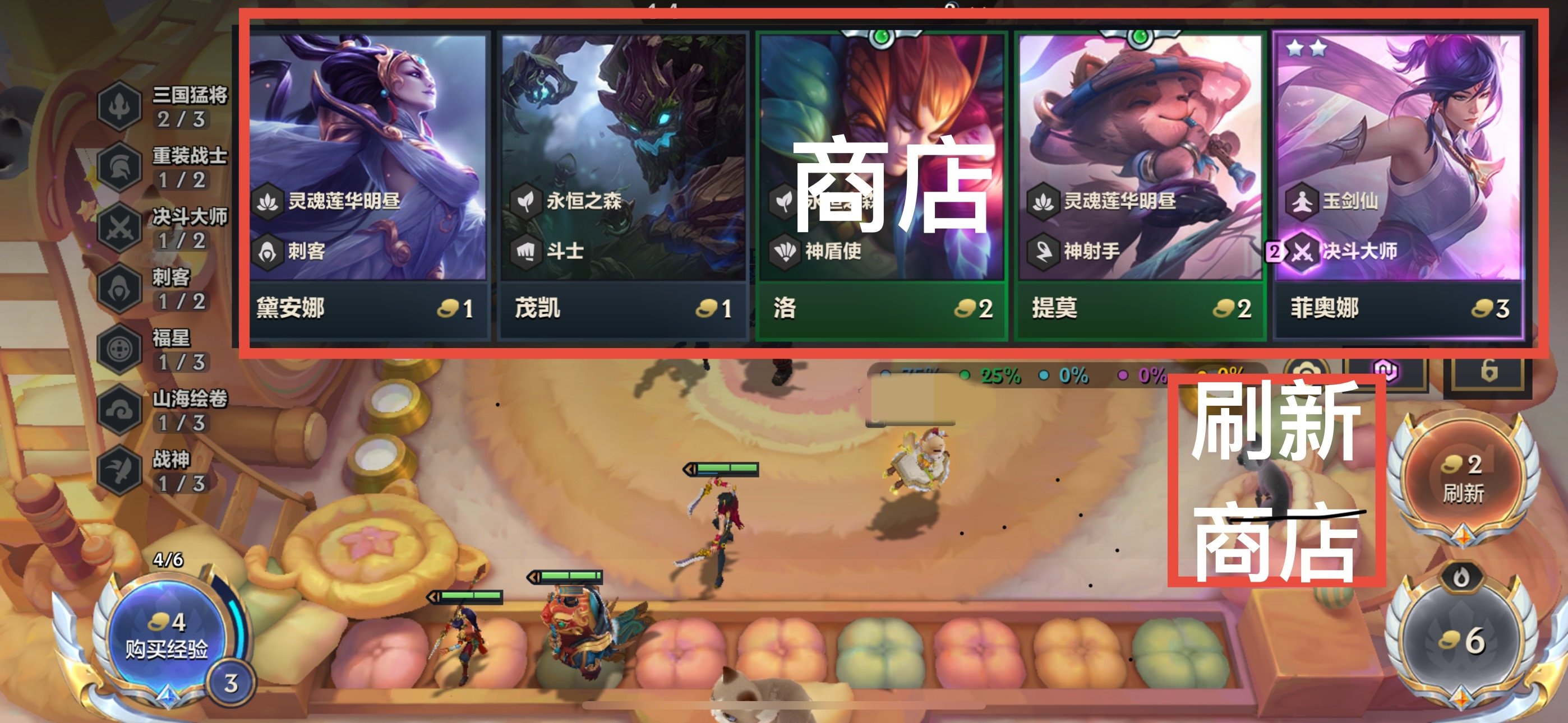 - 刷新商店:玩家通过花费金币,能够重新随机显示可以购买的棋子。玩家的等级越高,则越容易刷新出更高费用的棋子。