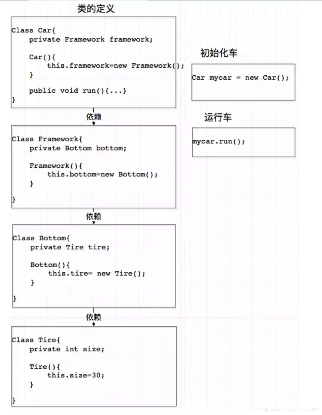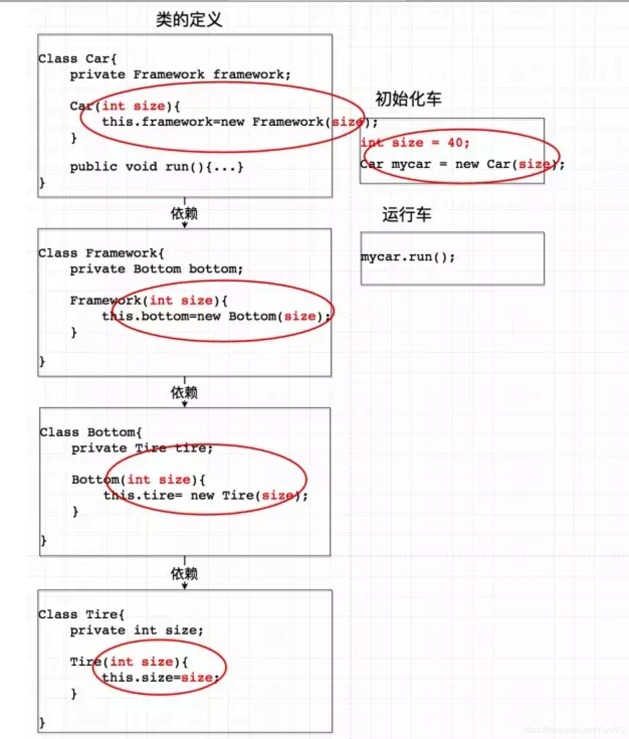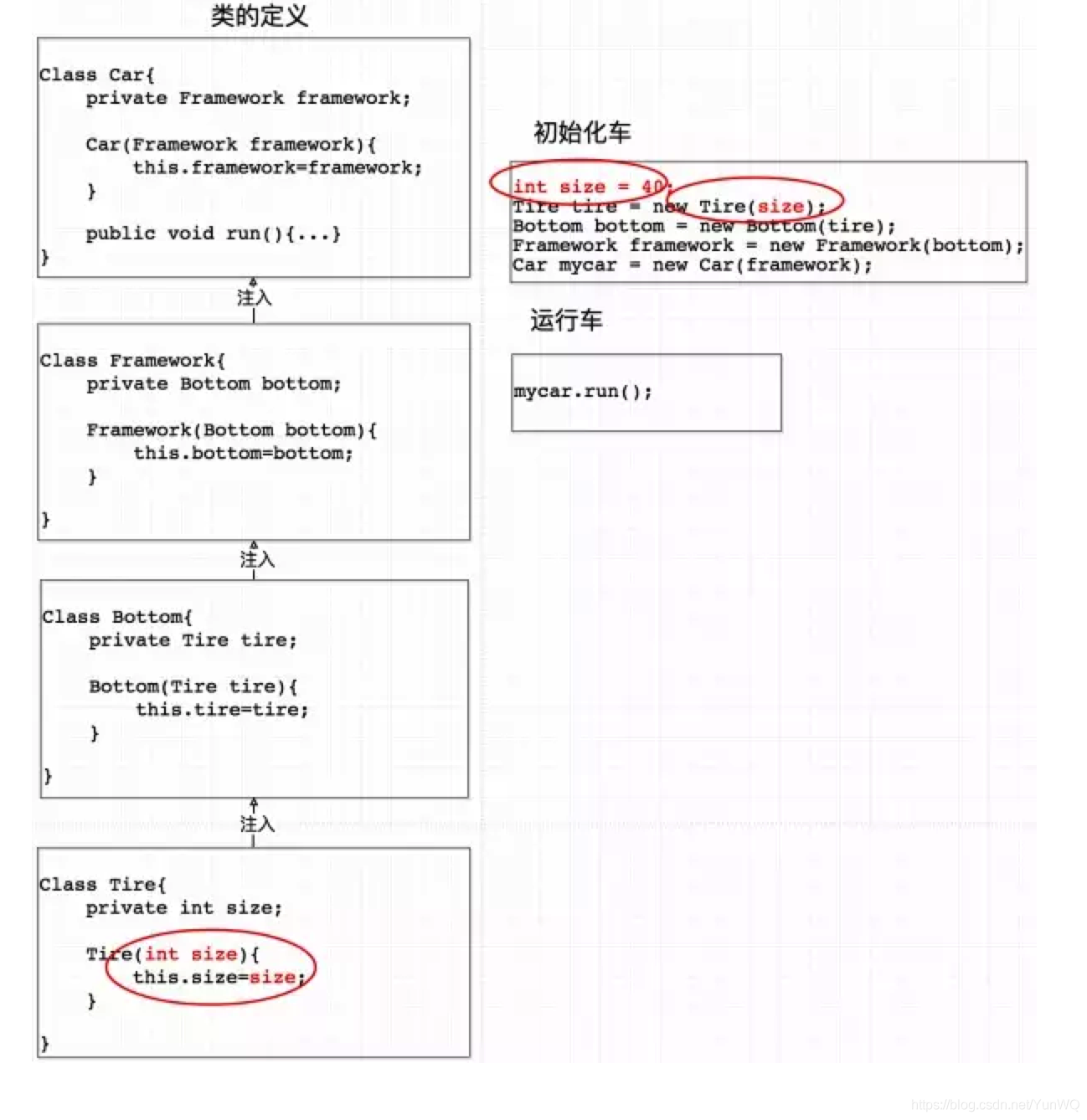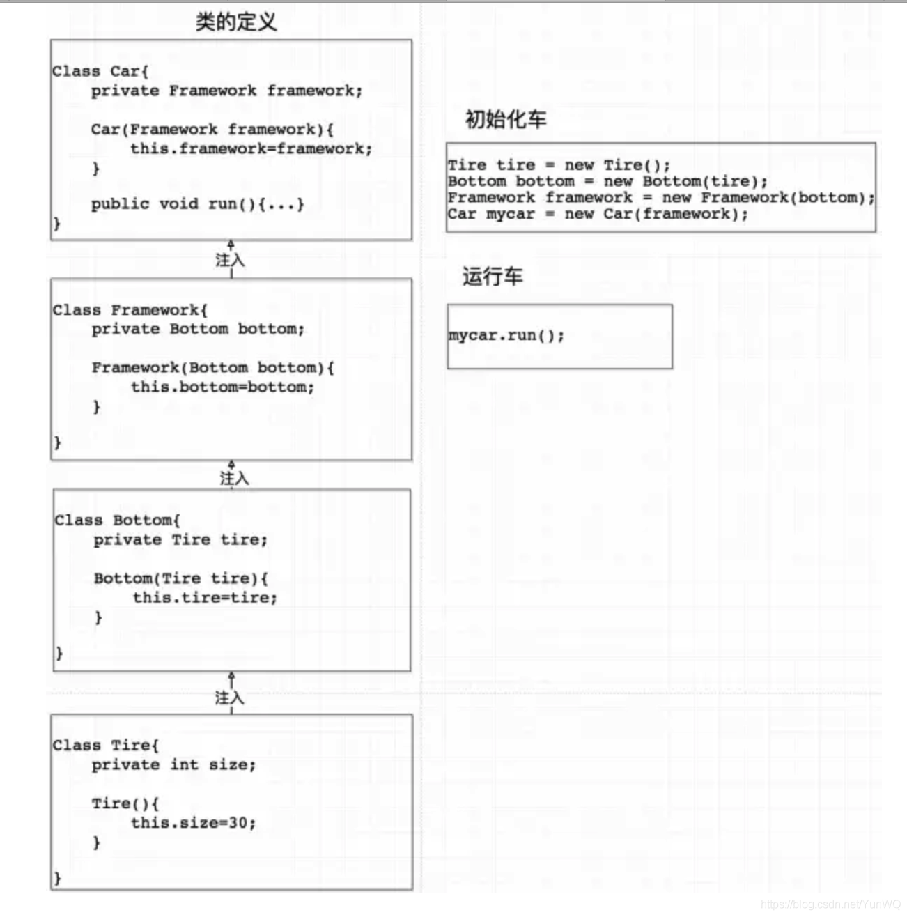 由此我们可以看到,仅仅是为了修改轮胎的构造函数,这种设计却需要修改整个上层所有类的构造函数!在软件工程中,这样的设计几乎是不可维护的——在实际工程项目中,有的类可能会是几千个类的底层,如果每次修改这个类,我们都要修改所有以它作为依赖的类,那软件的维护成本就太高了。所以我们需要进行控制反转(IOC),及上层控制下层,而不是下层控制着上层。 我们用依赖注入(Dependency Injection)这种方式来实现控制反转。所谓依赖注入,就是把底层类作为参数传入上层类,实现上层类对下层类的“控制”。这里我们用构造方法传递的依赖注入方式重新写车类的定义: