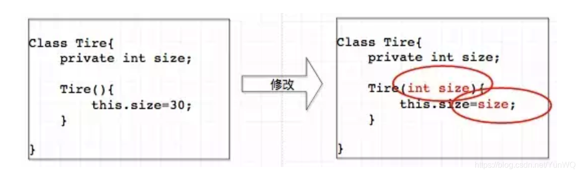上层建筑依赖下层建筑——每一个类的构造函数都直接调用了底层代码的构造函数。假设我们需要改动一下轮胎(Tire)类,把它的尺寸变成动态的,而不是一直都是30。我们需要这样改: