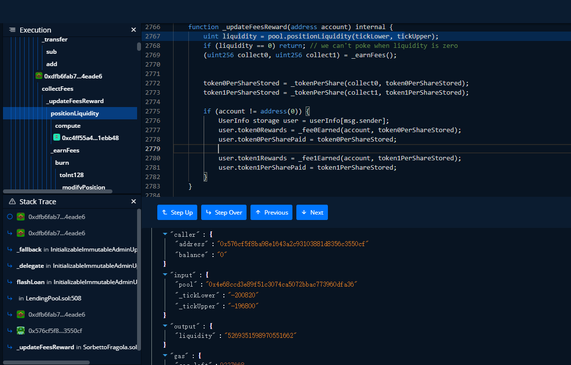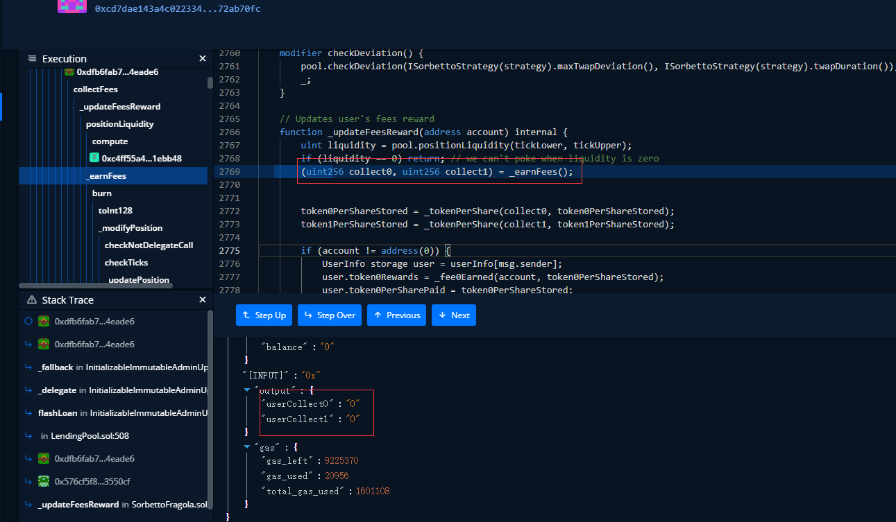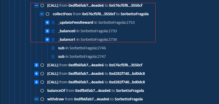 从图中,可知调用了SorbettoFragola合约中的collectFees函数,这里直接debug,一步一步看。