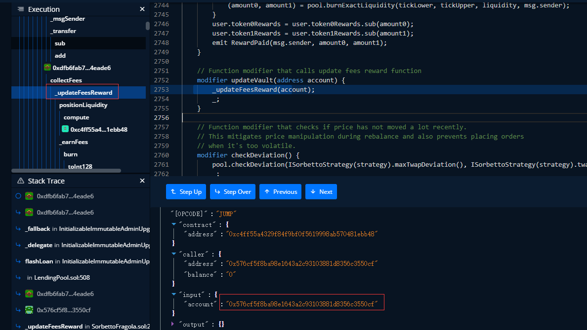 攻击合约B调用,SorbettoFragola合约中的collectFees函数,然后进入updateVault修饰器中的_updateFeesReward函数。account是攻击合约B。