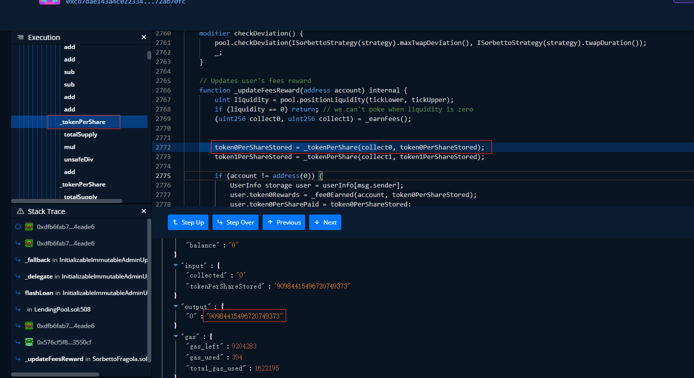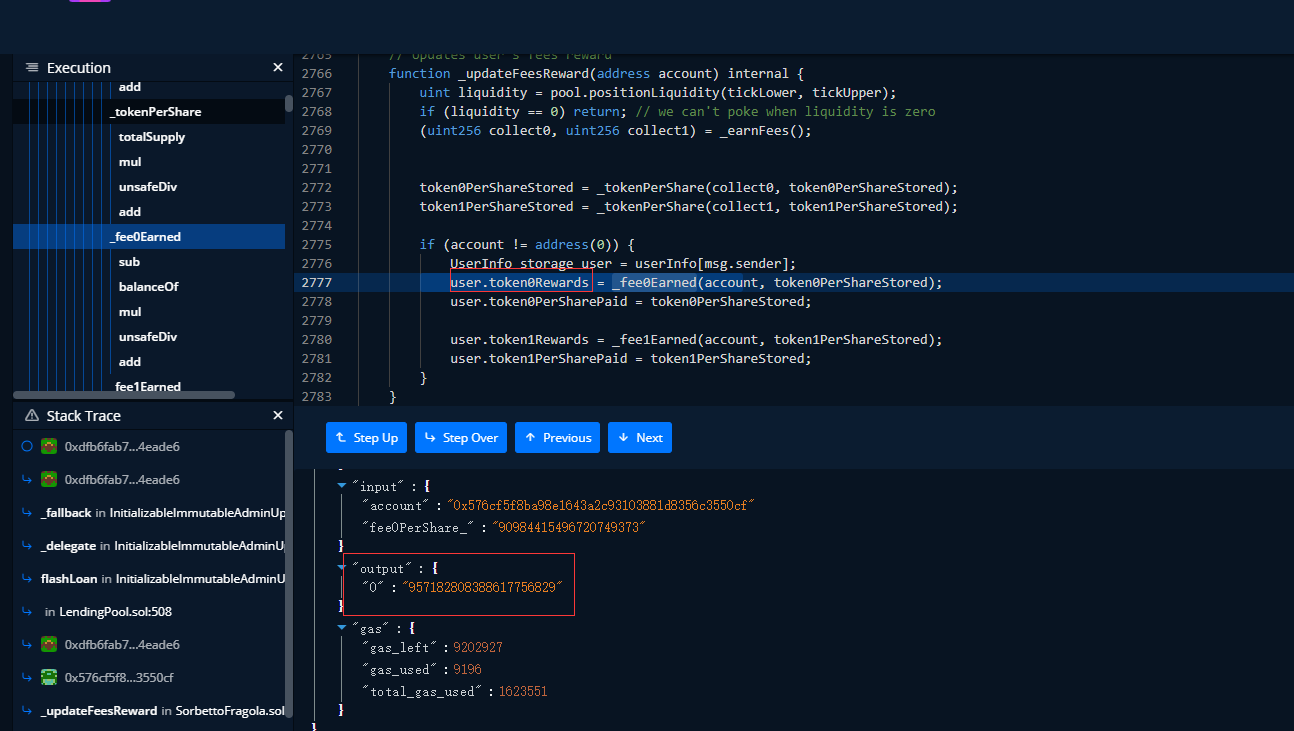 进入_fee0Earned函数,我们看到output就有问题了,因为对应参数user.token0Rewards,为"957182808388617756829",在往下面跟。