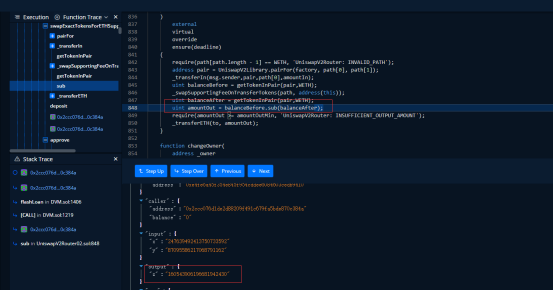 那么就可以把第一个pair中的WETH兑换到其他pair中,从而获利amountOut = balanceBefore.sub(balanceAfter)。