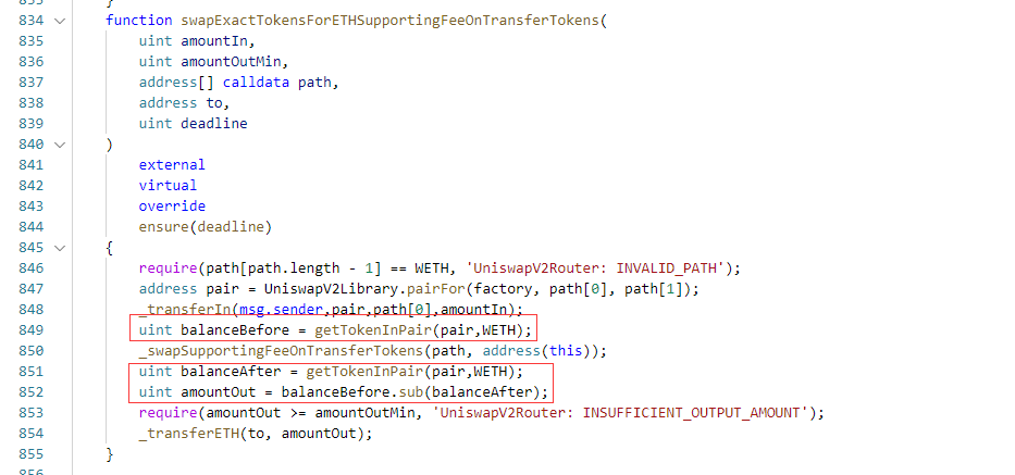 我们阅读了代码,发现swapExactTokensForETHSupportingFeeOnTransferTokens函数存在一个严重的逻辑漏洞,都是以第一个pair记录的WETH做计算。