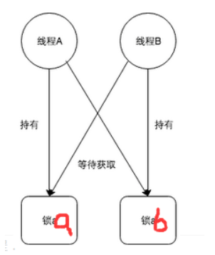 所谓死锁,是指多个进程在运行过程中因争夺资源而造成的一种僵局,当进程处于这种僵持状态时,若无外力作用,它们都将无法再向前推进。 因此我们举个例子来描述,如果此时有一个线程A,按照先锁a再获得锁b的的顺序获得锁,而在此同时又有另外一个线程B,按照先锁b再锁a的顺序获得锁。如下图所示: