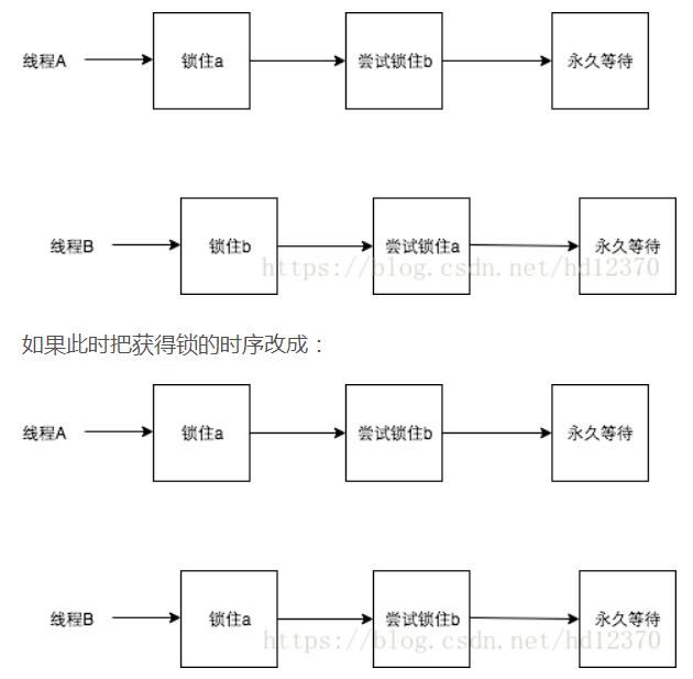 如果必须获取多个锁,那么在设计的时候需要充分考虑不同线程之前获得锁的顺序。按照上面的例子,两个线程获得锁的时序图如下: