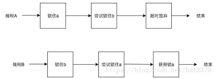 当使用synchronized关键词提供的内置锁时,只要线程没有获得锁,那么就会永远等待下去,然而Lock接口提供了boolean tryLock(long time, TimeUnit unit) throws InterruptedException方法,该方法可以按照固定时长等待锁,因此线程可以在获取锁超时以后,主动释放之前已经获得的所有的锁。通过这种方式,也可以很有效地避免死锁。 还是按照之前的例子,时序图如下: