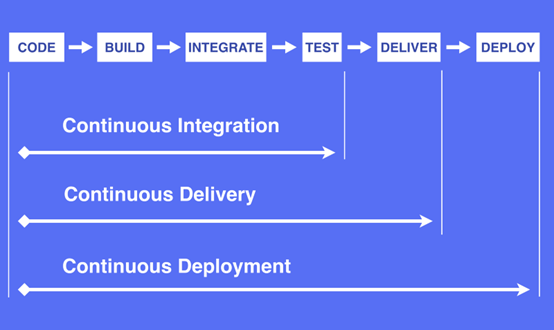 正如你在上图中看到,「持续集成(Continuous Integration)」、「持续交付(Continuous Delivery)」和「持续部署(Continuous Deployment)」有着不同的软件自动化交付周期。