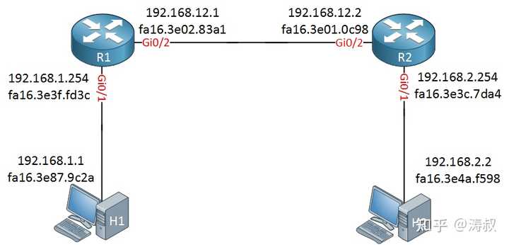 以上图为例,假如H1想给H2发数据。H1知道H2跟自己不在一个网络,所以它通过ARP查到R1的 Gi0/1 网卡的 MAC 地址,给 fa16.ee3f.fd3c