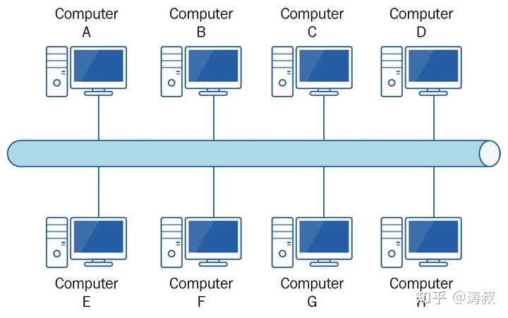 为了降低成本,人们想了另外一种连接方式,总线网线。