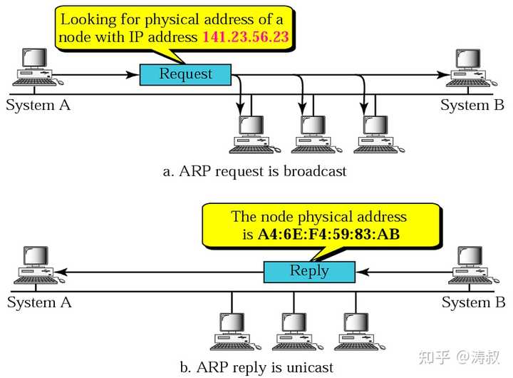 每当电脑在通信之前会先在网络上发一个广播(这个广播不会被转发到其他网络),问谁的IP地址是某某某。这个时候对应的电脑就会回包说是我,我的MAC地址是某某某。发送方就拿到了接收方的MAC地址,进而完成通信。