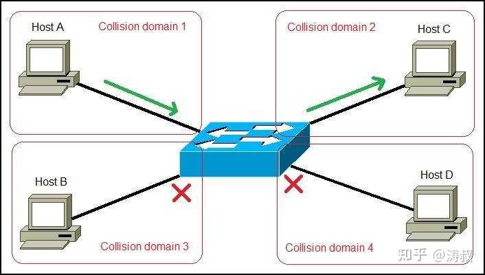 但是,交换交换机可以进一步减少广播的数量。以上图为例。如果A想给C发送数据,它会先通过ARP广播查询C的MAC地址。这一步是免不了的。但是,这一步也会被交换机监听/学习到,所以交换机会将C连接的网口跟C的MAC地址绑定到一起,等A给C发数据的时候,交换机只会给C发数据。这个时候B和D都收不到数据。不但收不到,B和D还可以在A与C通信期间进行通信,这就进一步提高了网络的利用效率。