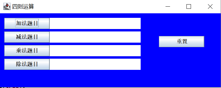 其中界面颜色、按钮参数等可在代码中修改;通过点击加法/减法/乘法/除法题目,可以实现自动出题,点击重置则可以清除已有题目。