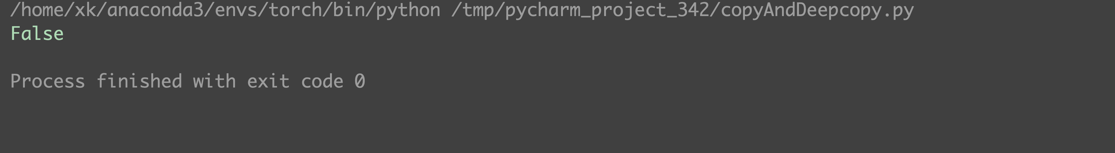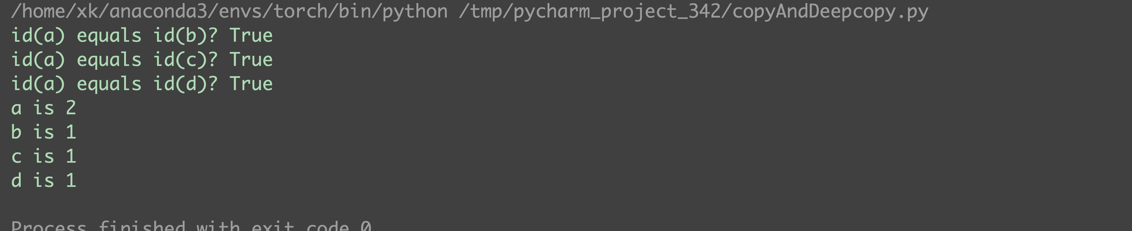 import copy a = 1 b = a # 赋值操作 c = copy.copy(a) # 浅拷贝 d = copy.deepcopy(a) # 深拷贝 print(f'id(a) equals id(b)? {id(a) == id(b)}') print(f'id(a) equals id(c)? {id(a) == id(c)}') print(f'id(a) equals id(d)? {id(a) == id(d)}') a = 2 print(f'a is {a}') print(f'b is {b}') print(f'c is {c}') print(f'd is {d}')