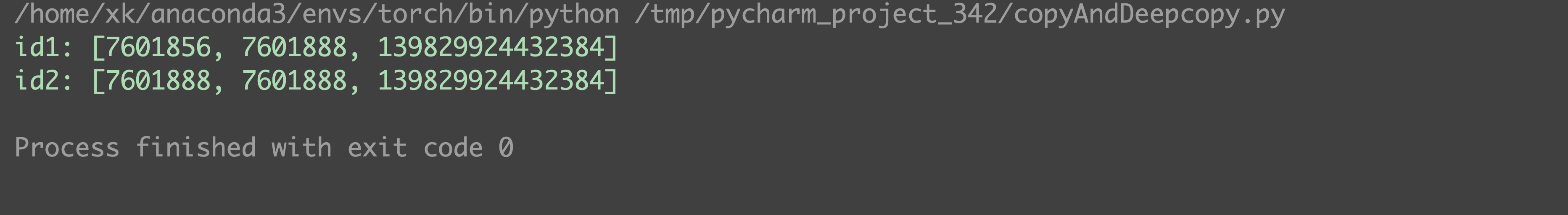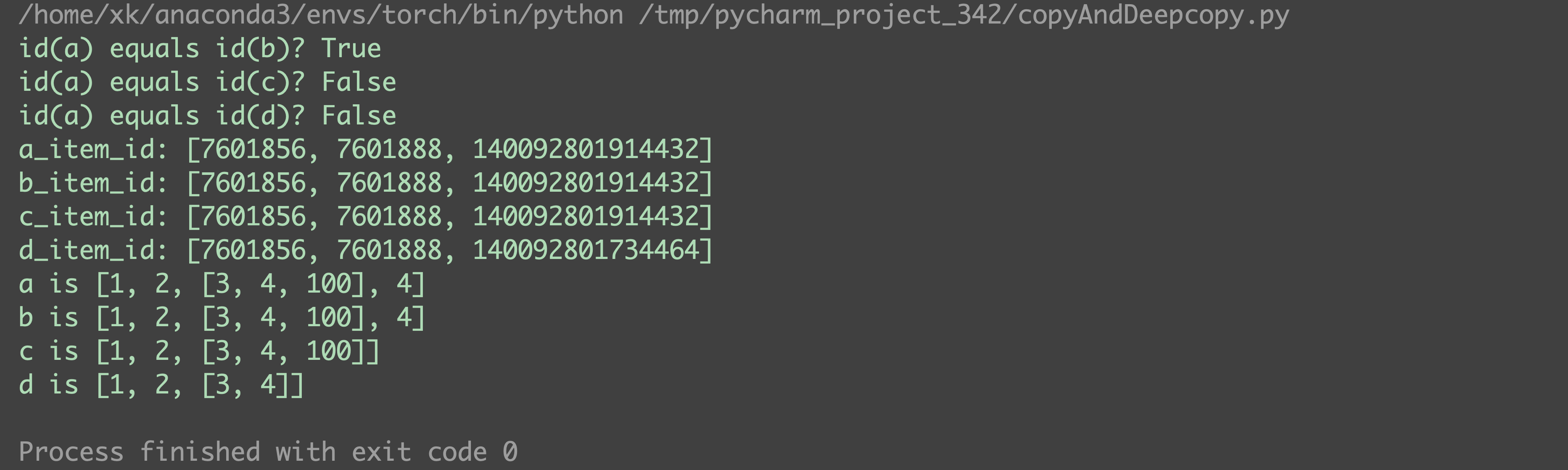 import copy a = [1, 2, [3, 4]] b = a # 赋值操作 c = copy.copy(a) # 浅拷贝 d = copy.deepcopy(a) # 深拷贝 print(f'id(a) equals id(b)? {id(a) == id(b)}') print(f'id(a) equals id(c)? {id(a) == id(c)}') print(f'id(a) equals id(d)? {id(a) == id(d)}') a_item_id = [id(_) for _ in a] b_item_id = [id(_) for _ in b] c_item_id = [id(_) for _ in c] d_item_id = [id(_) for _ in d] print(f'a_item_id: {a_item_id}') print(f'b_item_id: {b_item_id}') print(f'c_item_id: {c_item_id}') print(f'd_item_id: {d_item_id}') a.append(4) a[2].append(100) print(f'a is {a}') print(f'b is {b}') print(f'c is {c}') print(f'd is {d}')