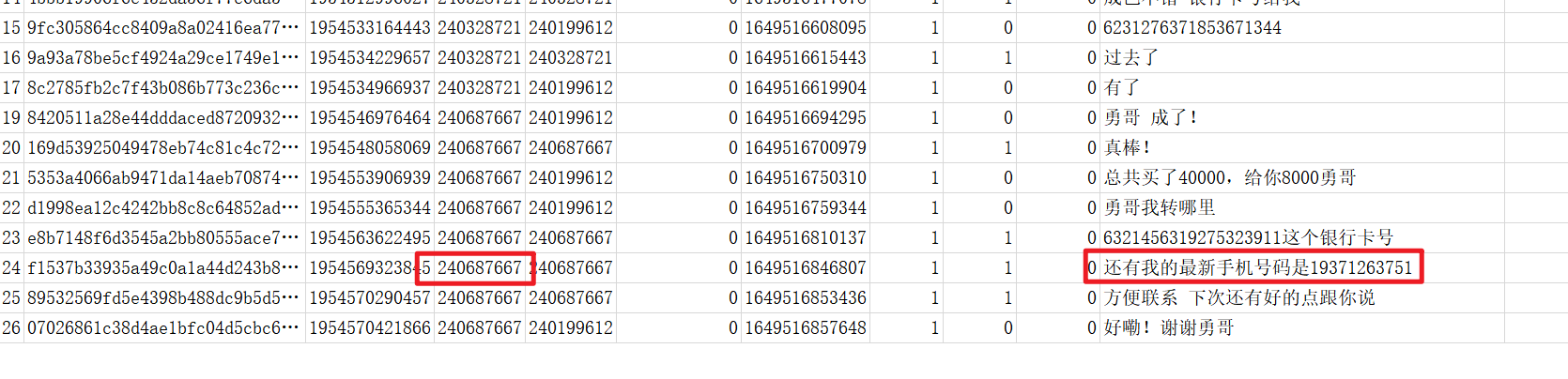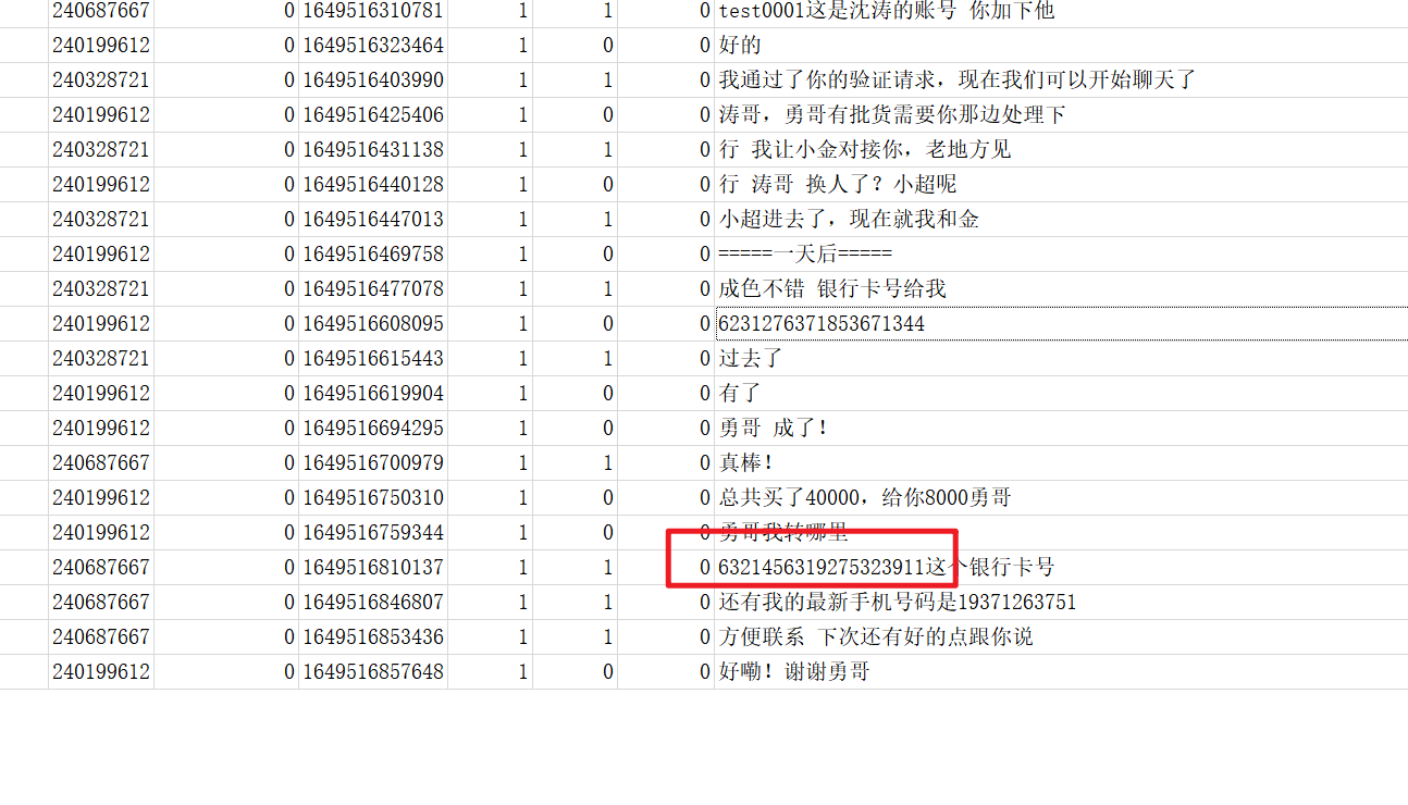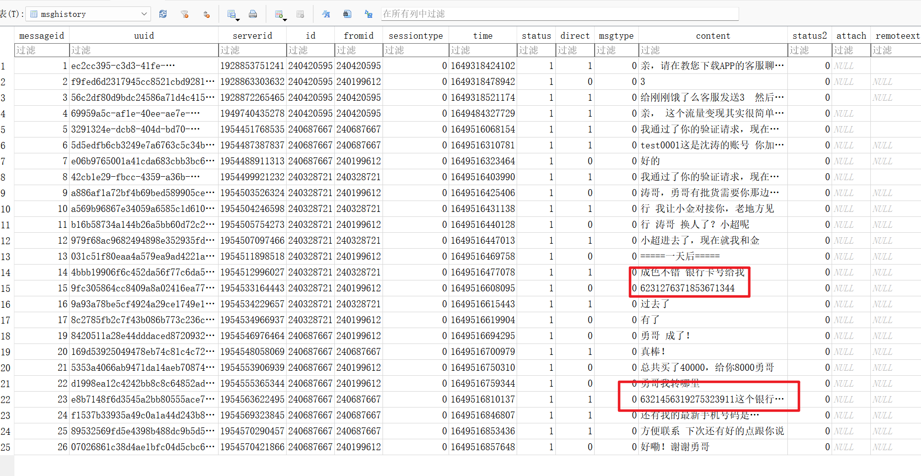 在msghistory表里看到聊天记录,但是聊天记录中提到了两个银行卡号