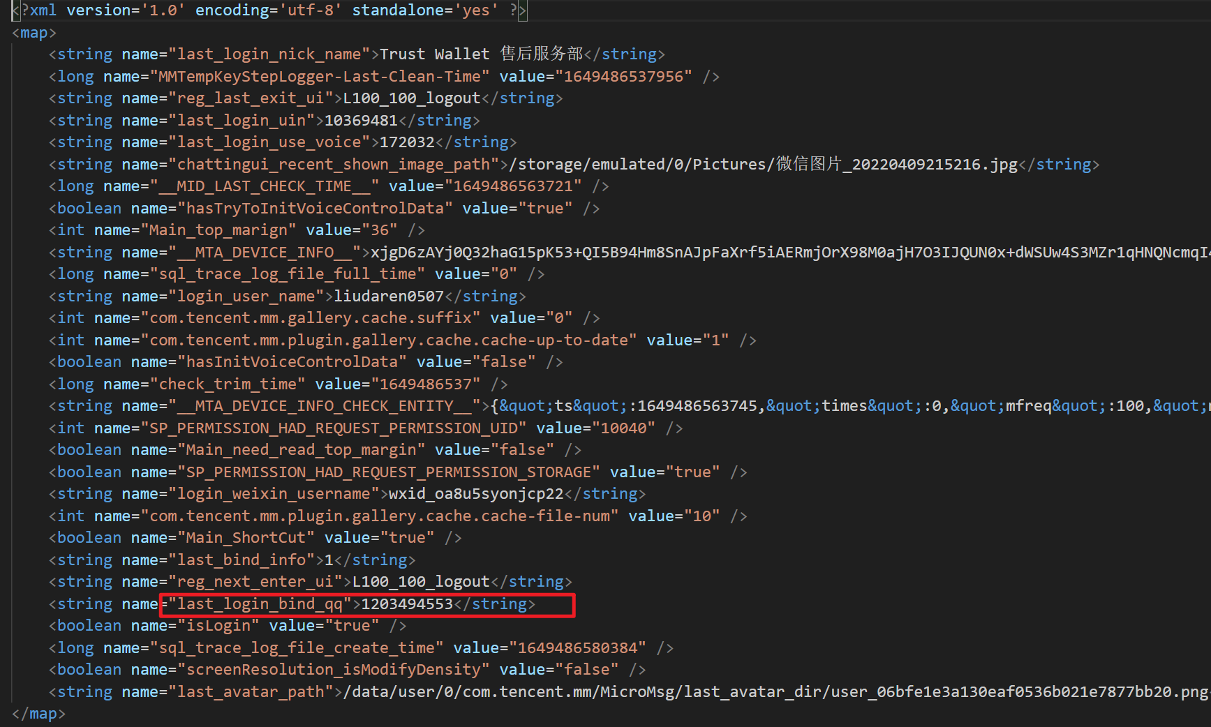 提到qq号,第一想法是找qq的数据库,但在文件目录下并没有找到,联系后面提到微信 可能qq号会存在微信里。机主的用户信息存储在<font style="color:rgba(0, 0, 0, 0.87);">/shared_prefs/com.tencent.mm_preferences.xml</font>,在xml里发现绑定的qq号