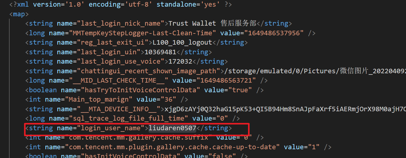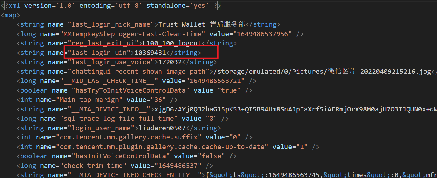 2.获取uin,uin可以在sp文件目录里找到,如目录下的com.tencent.mm_preferences_redesign.xml或者auth_info_key_prefs.xml