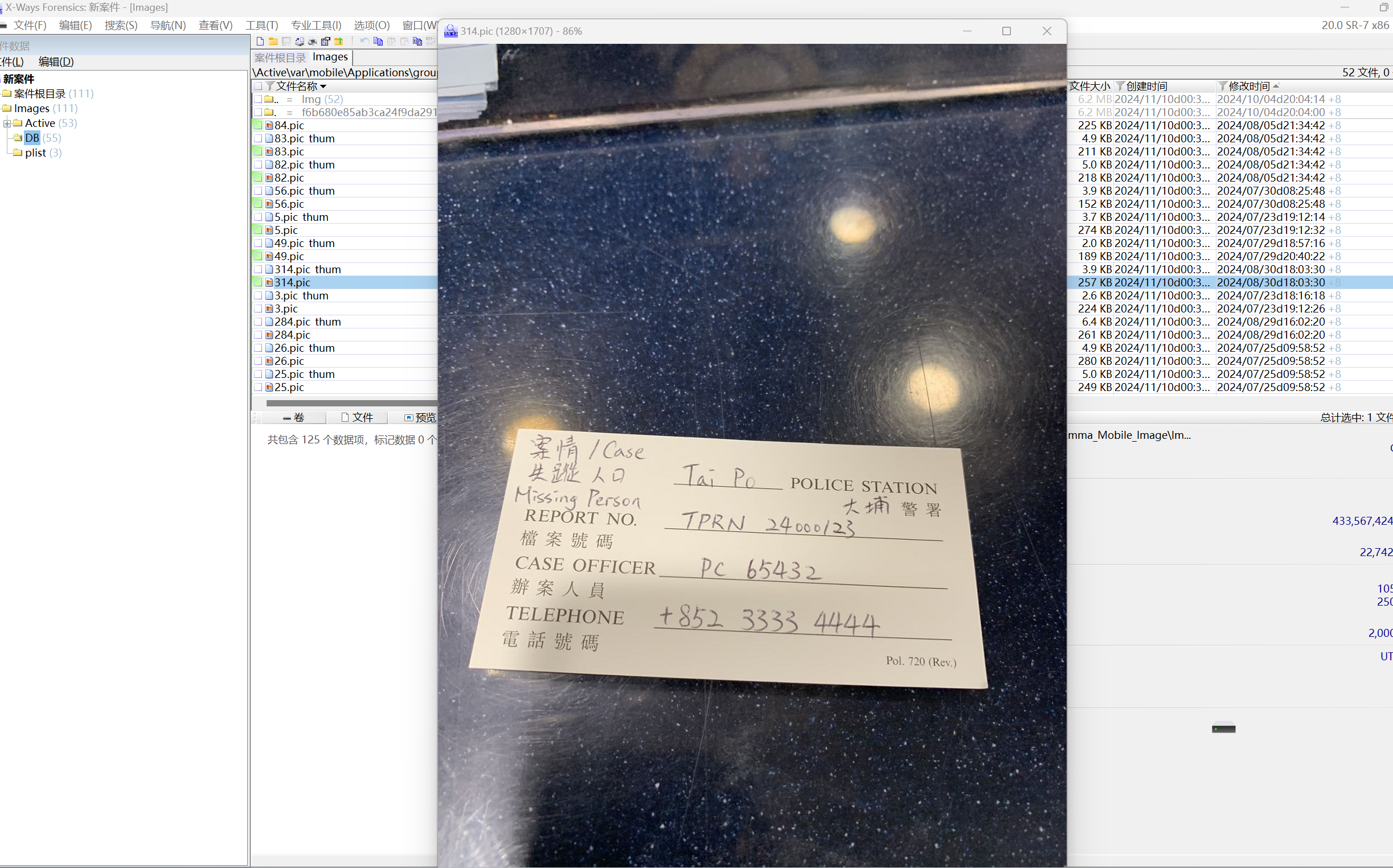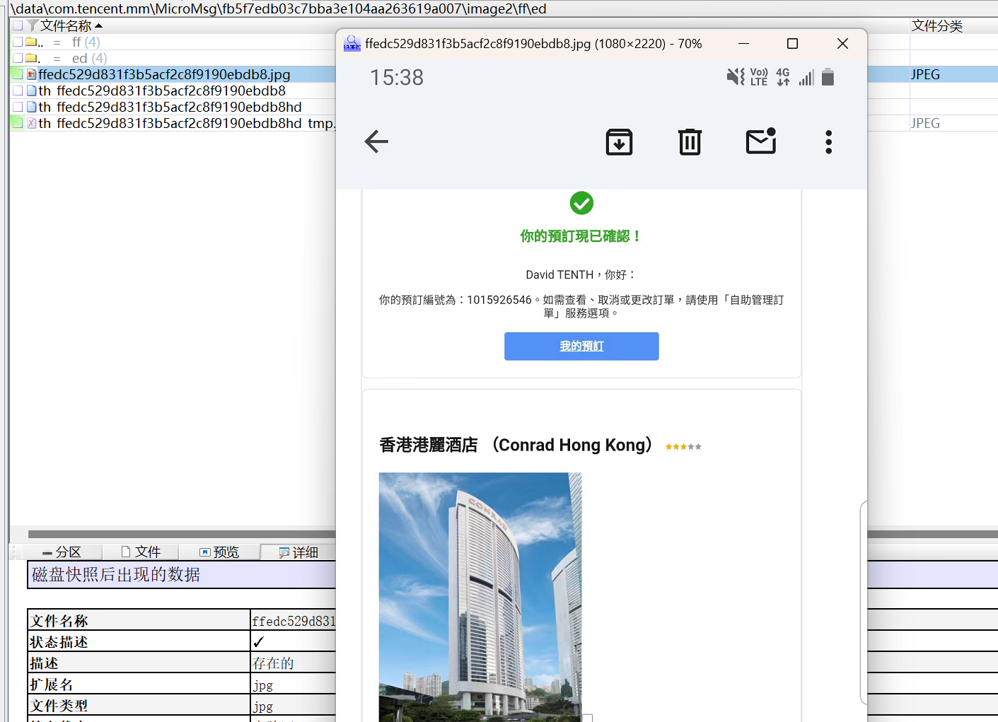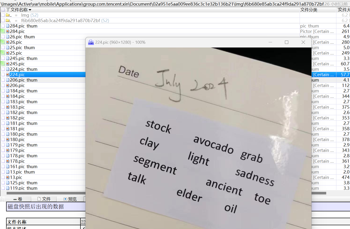 emma的手机检材更像是提取了一部分,并不是很完整,再者题目说到拍摄时的经纬度,那么就得找到相册,再看图片的属性或者进行识图。检材里图片存放的位置是在微信的目录下,路径:\Active\var\mobile\Applications\group.com.tencent.xin\Document\02a951e5aa009ee836c3c1e32b136b21\Img\f6b680e85ab3ca24f9da291a870b72bf\314.pic