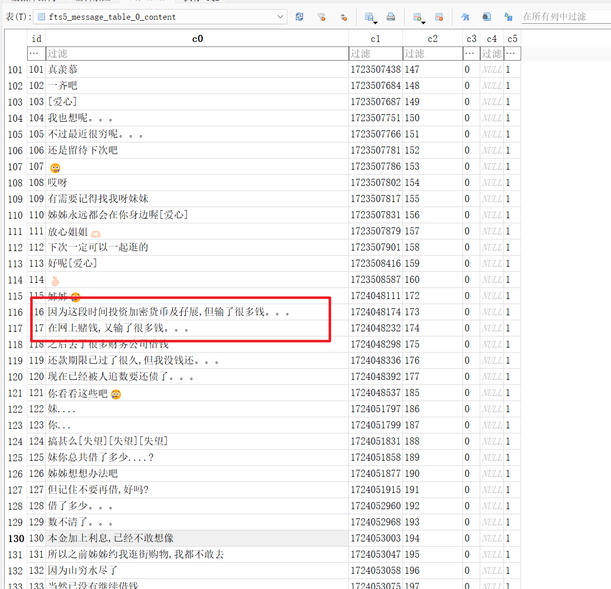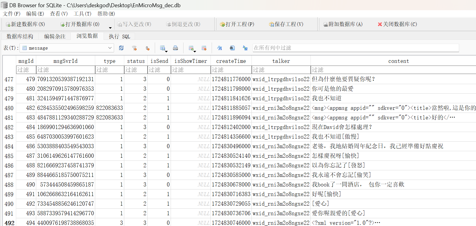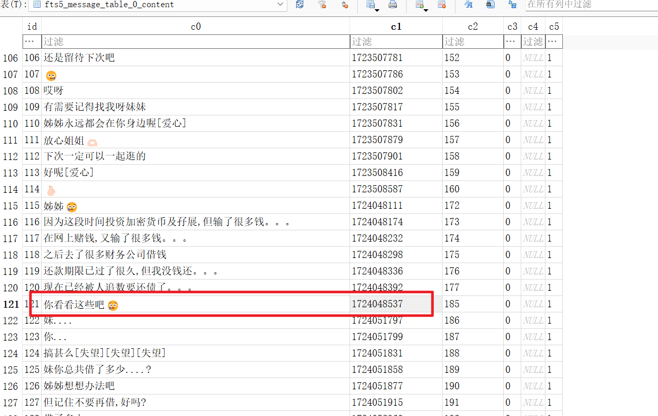 在微信聊天记录可以看到,路径:\Images\DB\fts_message.db,在fts5_message_table_3_content里找到