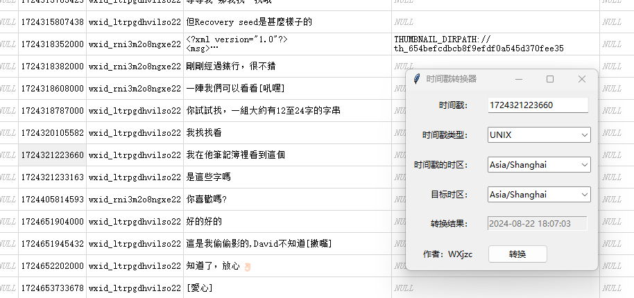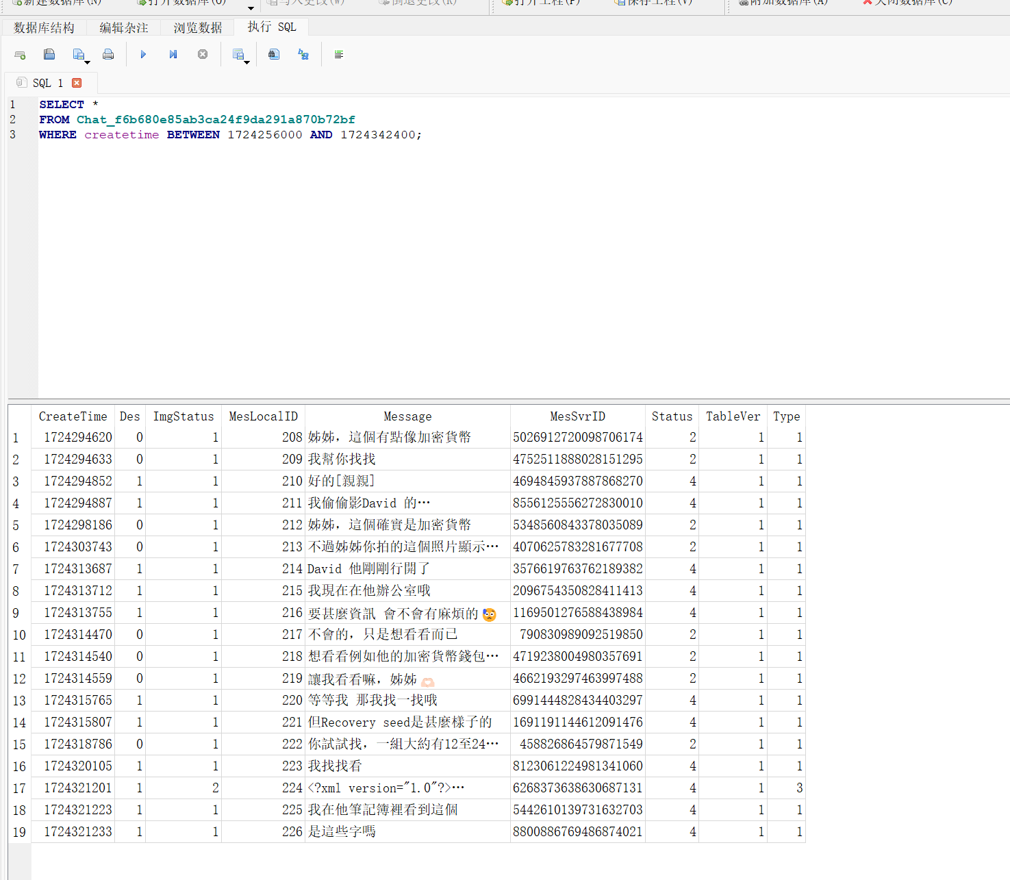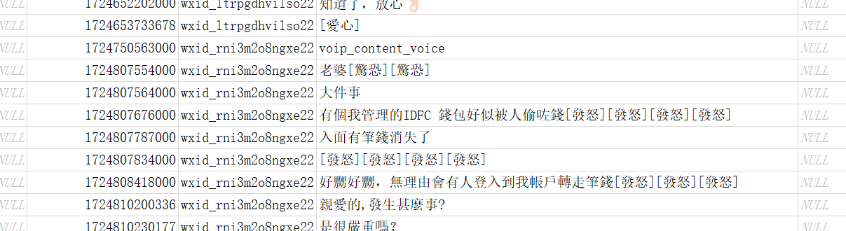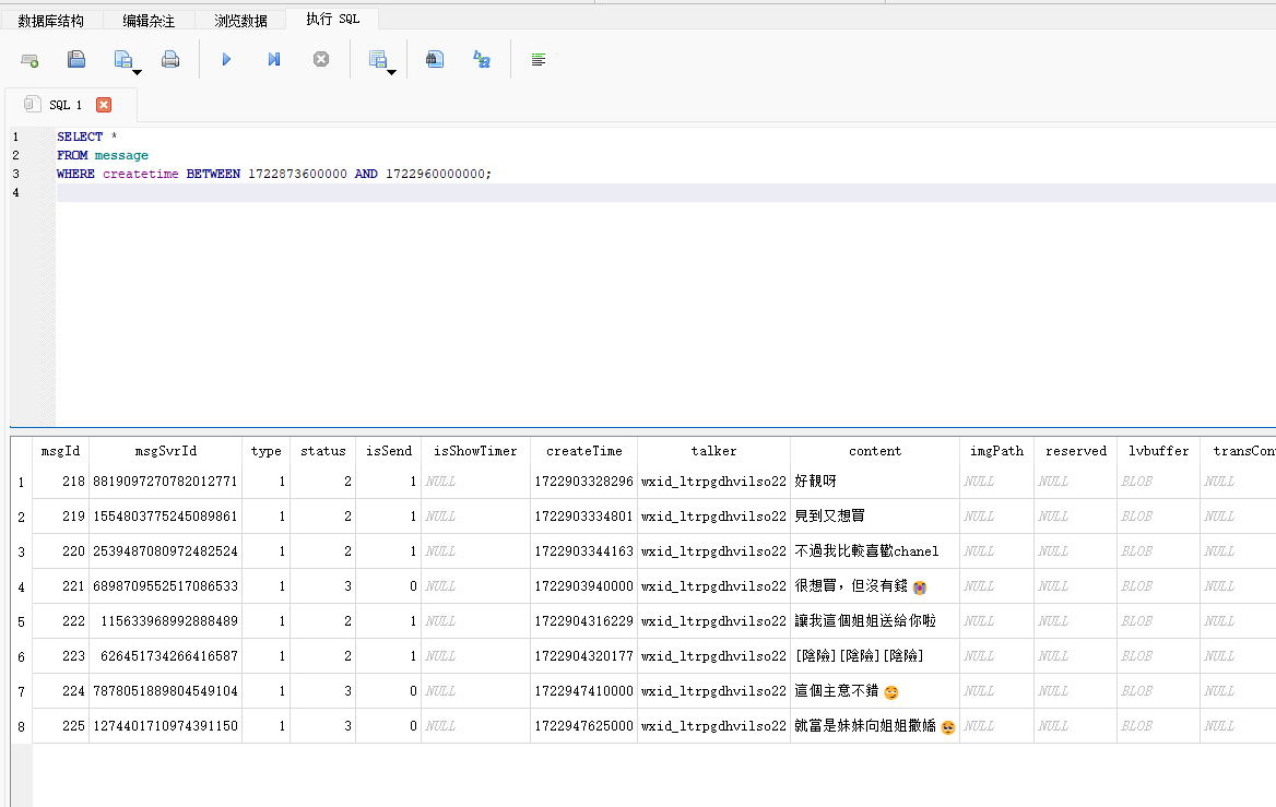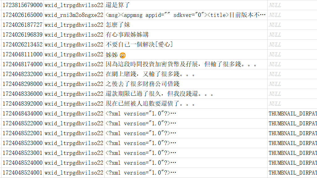 在微信聊天记录可以看到,路径:\Images\DB\fts_message.db,在fts5_message_table_3_content里找到