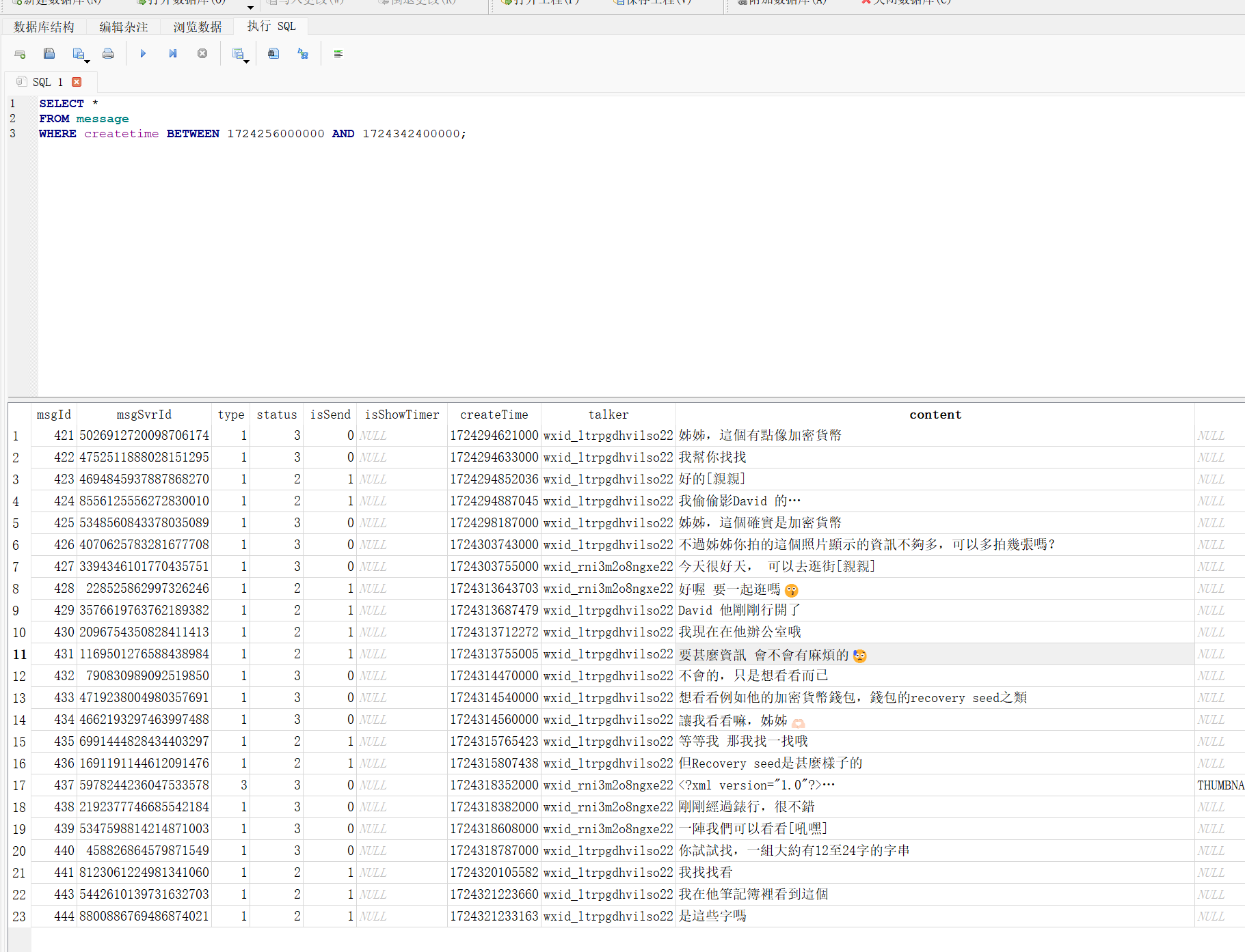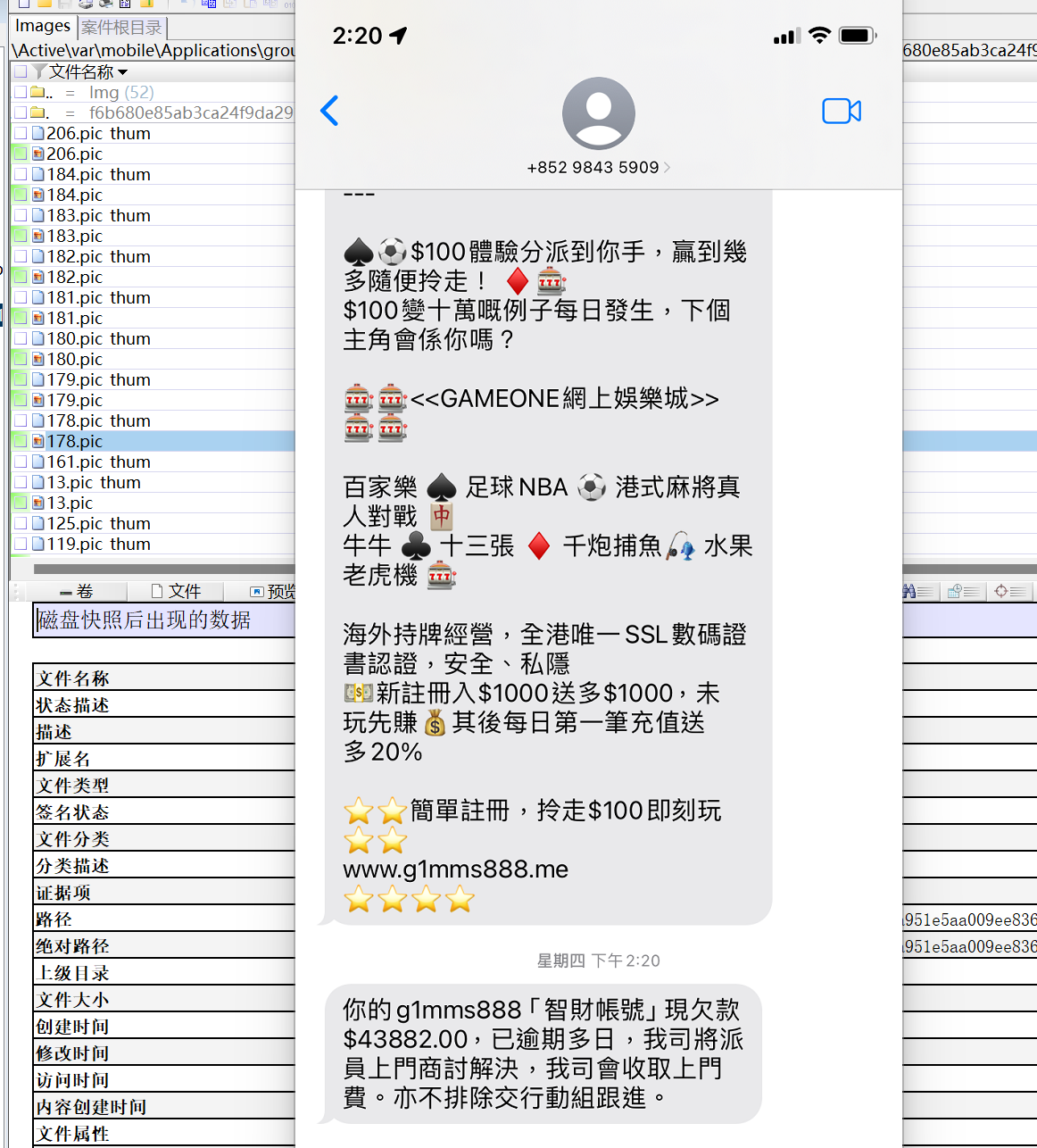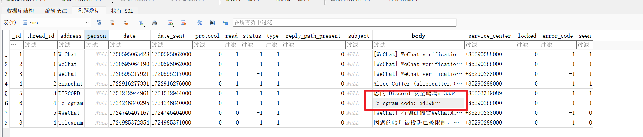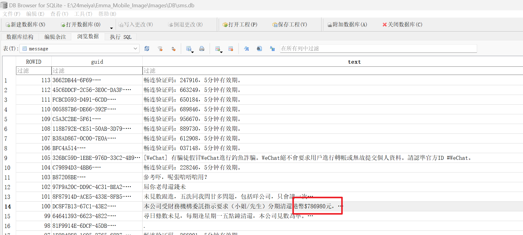 在微信的图片记录里找到了短信催债记录,所以去到短信数据库里找,路径:Images\DB\sms.db,sms
