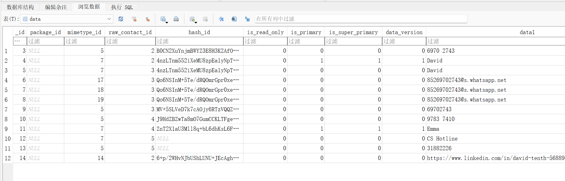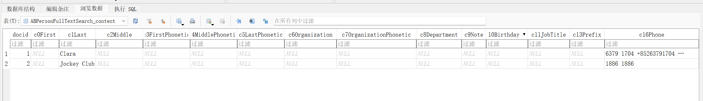 先找Clara的电话号码,在通讯录数据库里可以找到:\DB\AddressBook.sqlitedb.db