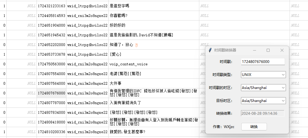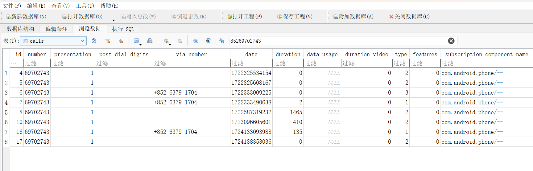 确定电话号码为+85263791704,再到同目录下的CallHistory.storedata.db查看通话记录,ZHANDLE记录电话号码,ZNORMALIZEDVALUE记录通话记录,两个表的共同之处就是Z_PK,通过这个关键字将两个表合并,在合并起来的表里筛选出电话号码为+85263791704,且时间戳大于745826400(2024年8月30日下午两点)
