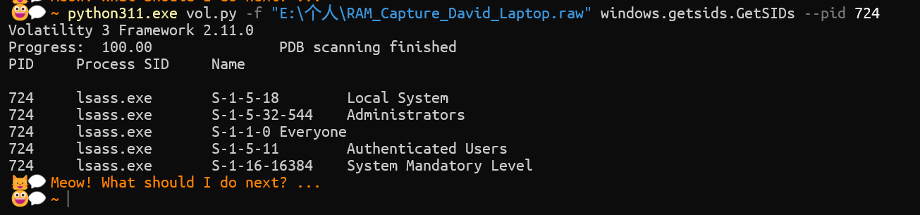 python311.exe vol.py -f "E:\个人\RAM_Capture_David_Laptop.raw" windows.getsids.GetSIDs --pid 724