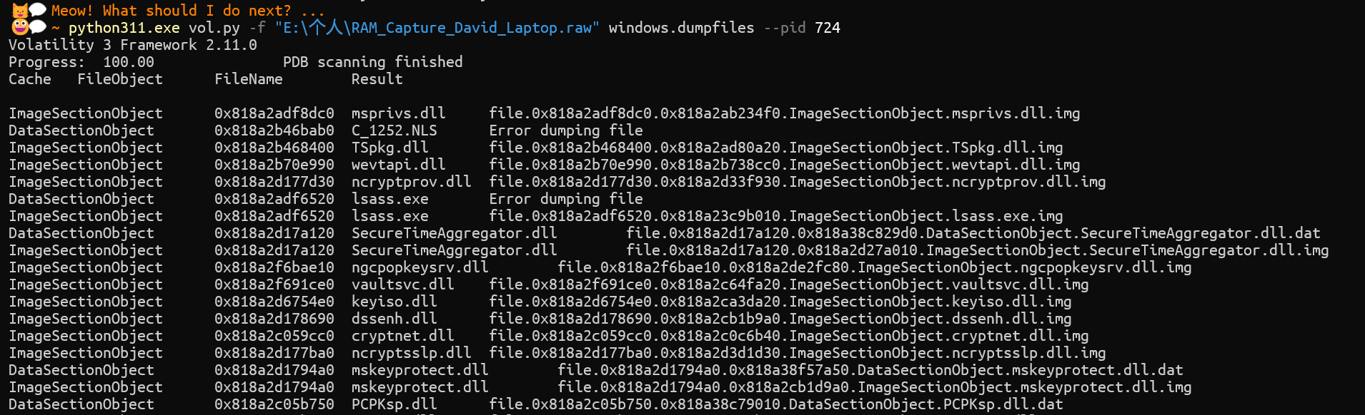 python311.exe vol.py -f "E:\个人\RAM_Capture_David_Laptop.raw" windows.dumpfiles --pid 724