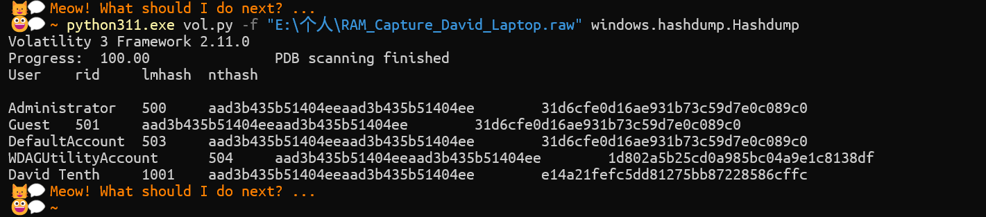 python311.exe vol.py -f "E:\个人\RAM_Capture_David_Laptop.raw" windows.hashdump.Hashdump