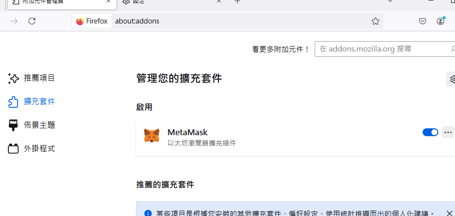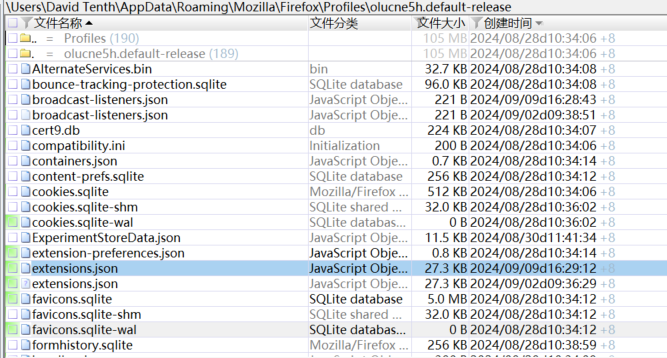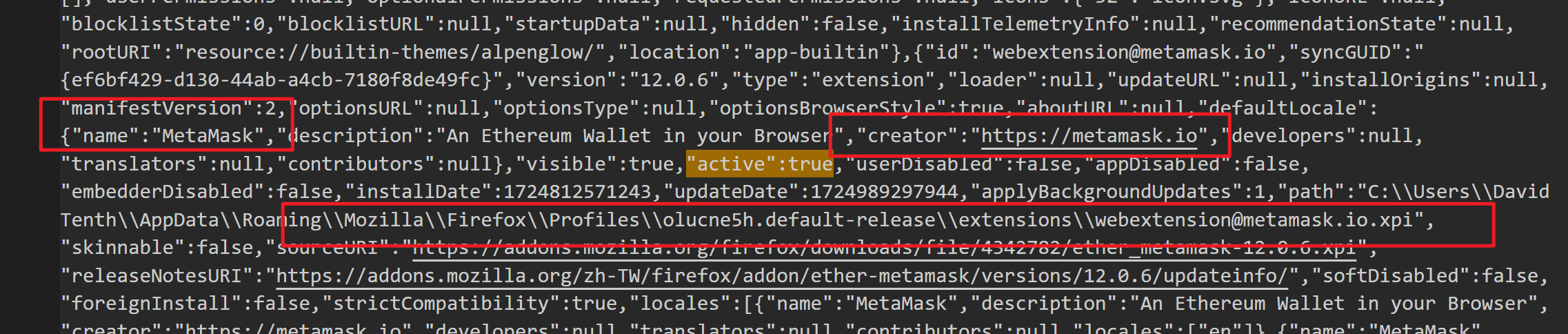 Firefox有关拓展的文件是extensions.json,路径:\Users\David Tenth\AppData\Roaming\Mozilla\Firefox\Profiles\olucne5h.default-release\extensions.json,找active为true,再看path,如果指向\Mozilla\Firefox\browser\features\,那说明是内置的插件,直接可以排除