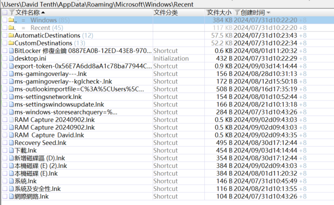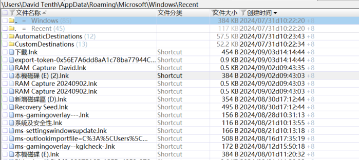 找recent目录,路径:\Users\David Tenth\AppData\Roaming\Microsoft\Windows\Recent